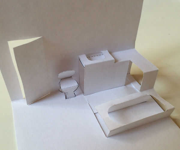Después de un rato, me di cuenta de que algunas personas podrían disfrutar decorando su casa, así que diseñó otra serie de habitaciones emergentes, esta vez sin nada impreso en ellos. Una casa pop-up en blanco puede teñirse usted mismo. Estas habitaciones en blanco están diseñadas para encajar en esta casa. Debo advertir que estas habitaciones son un poco demasiado complicadas para un niño en su propio. No podía ayudar a mí mismo, cuando les diseñé, decidió hace enteramente de una hoja de papel, que significa el diseño puede ser intrincado, pero muy divertido!