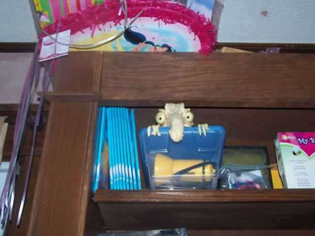 Poner sus garras en ambos lados de la cabeza de duende y ajustar así que parece que es aferrarse a la cornisa.