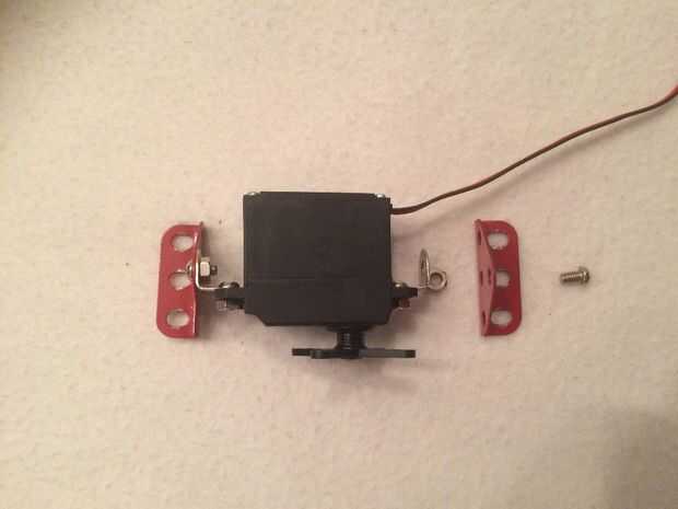 Conecte el BTB-5 en el servo por lo que puede soportar, con dos tornillos y dos tuercas (6mm). (Mina son de color rojo, supongo que porque mi set de Mechanix es de 1993...)