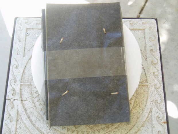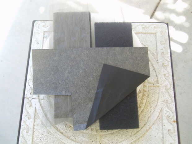 Como veis en la foto es un bocadillo. La capa inferior es espuma de poliestireno, es una capa de tela conductora, a continuación, dos pastillas de carbono puso lado a lado. Esto es seguida por otra capa de tela conductora, entonces el papel del carbón. Como veis en la foto se coloca el papel carbón con la cara brillante hacia la tela conductora.