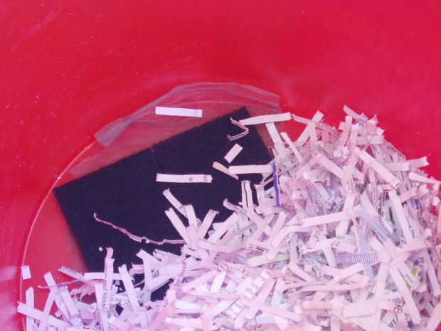 A continuación preparar el montaje del ánodo en la parte inferior de la lata (ver imagen). Esto se realiza estableciendo una 8 x 5 pulgadas pedazo de papel carbón, seguido por una de 8 x 5 pulgadas pieza conductora luego las dos restantes almohadillas del filtro del acuario.