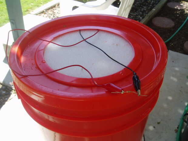 Después de haber agregado la soda Coloque el cubo fuera en sol de la tarde por un par de horas para ventilar el gas. El llenar el balde el resto de la mitad con agua. La espuma de poliestireno que flotan en el agua y presiona contra la tapa para obtener un sello (más o menos).