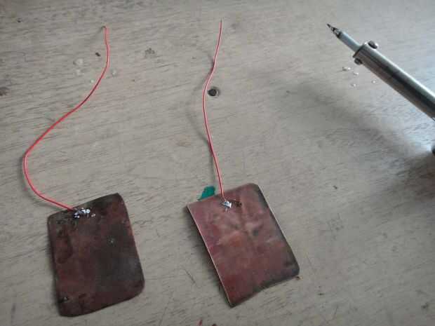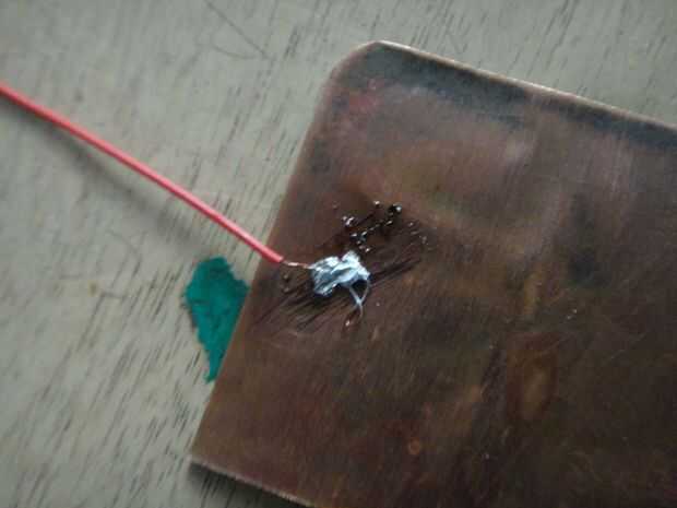 ahora toma el cobre caliente y soldar un cable a la toma de it.now una placa de cobre normal y añadirle un cable.