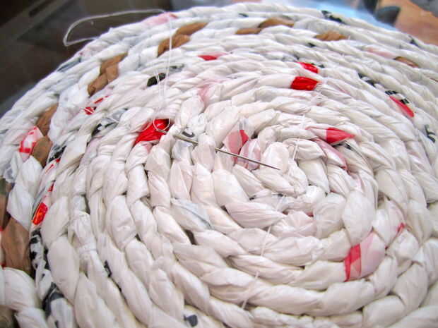 - anclar el hilo en un extremo empujando a través de la primera ronda, y luego volviendo sobre y a través de él otra vez.