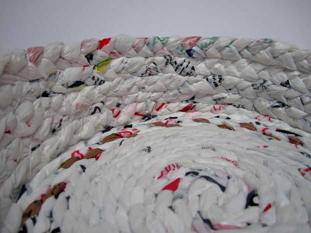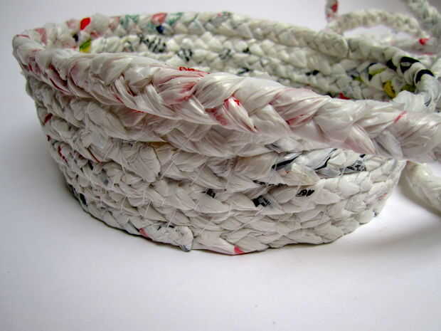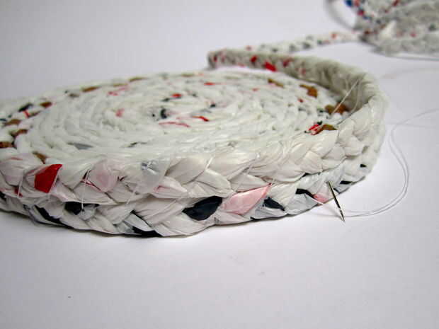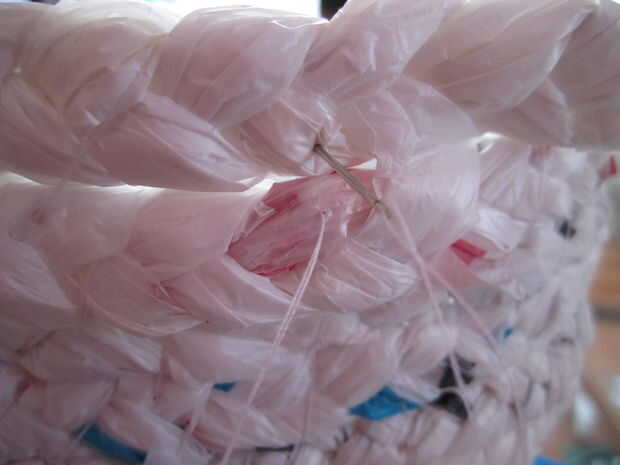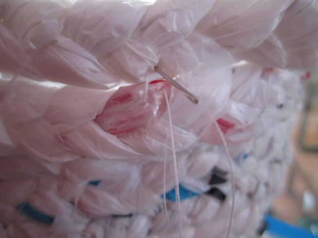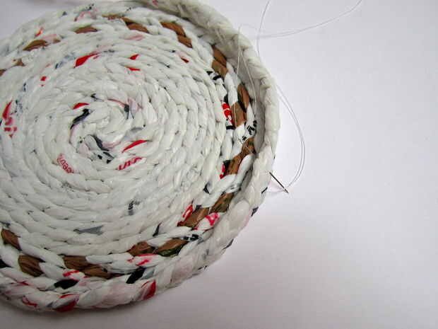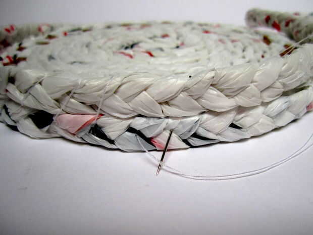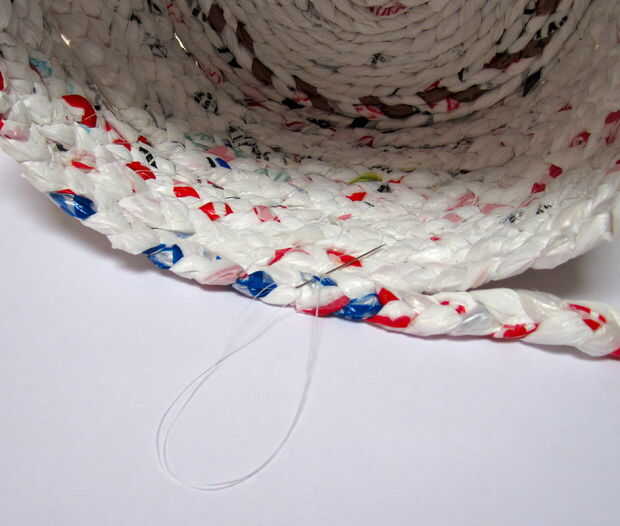Agarrar la cola de la trenza que cubrió en la base y subir diagonalmente para formar la fila inferior de la cesta. Empuje la aguja hacia abajo a través de la base como se muestra en la primera foto y llevarla sobre la trenza y hacia abajo a través de la base para garantizar la fila inferior. Para ello cada 1-2 pulgadas, manteniendo el hilo diagonal y apretado y las trenzas vertical y recta, hasta que te queda con 3-4 pulgadas de hilo.