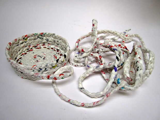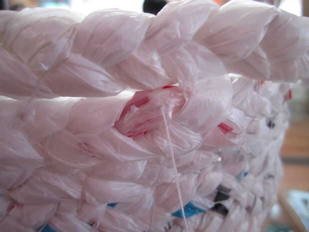 Luego, fije las dos capas de trenzas como se muestra en los cuadros 8-11 y el nudo en el interior de la canasta como se muestra en la última foto.