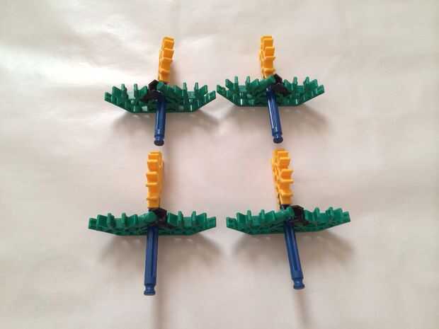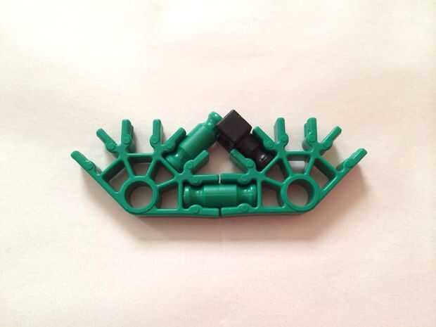 Conectar dos conectores verdes con barras verdes. Agregue una barra más verde y un conector en "Y". Además, conecte una barra azul a un conector amarillo y deslice la varilla azul por la pieza verde como se muestra. Repita el procedimiento para obtener cuatro piezas idénticas y conectan con el resto de la cesta utilizando barras verdes.