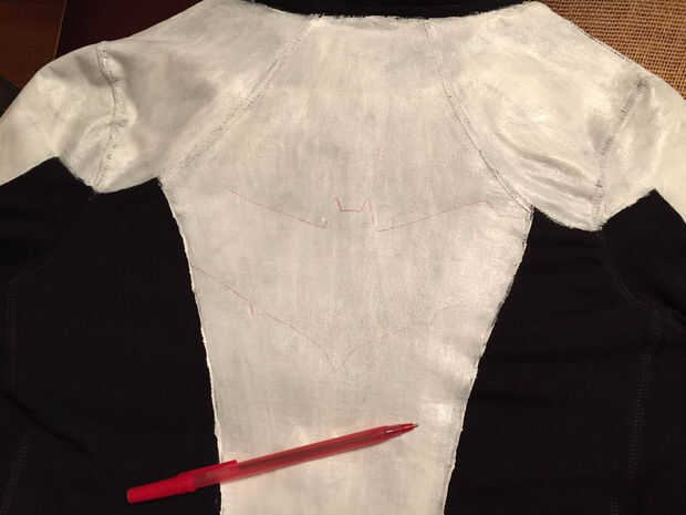 Esto sería una chaqueta de capucha roja sin el símbolo del murciélago. Encontramos una imagen del símbolo en línea e impresa para llenar la anchura de un 8.5 "x 11" papel. Esto sirvió como nuestra plantilla. Una vez trazado, fue pintado en pintura de tela roja.