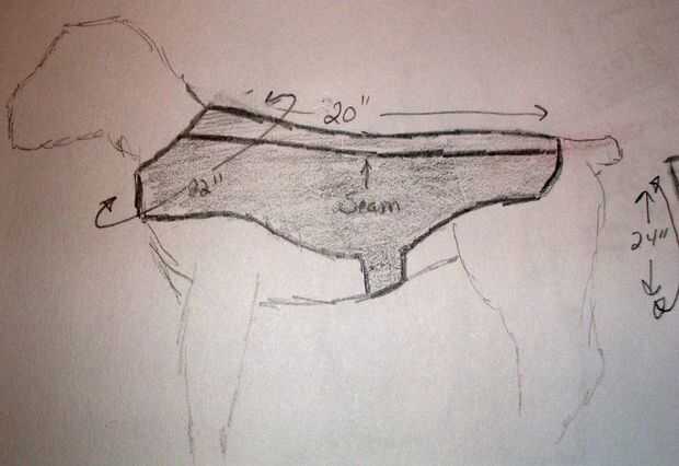 Más ropa para perros es un plan bastante simple.  Más o menos imaginar una manta con un agujero en la parte delantera para poner la cabeza a través de y algo que fije alrededor del estómago o del pecho.  No tengo una cinta de paño para medir mi perro así que utiliza una cadena para medir y llevó a cabo a una cinta métrica había abierto en una mesa para obtener las longitudes.  Mida alrededor del cuello abajo donde se encuentra generalmente el collar y asegúrese de que usted deje espacio para la cabeza del perro caber a través.  Recuerde que siempre es más fácil que fuera un poco más que chatarra lo y empezar de nuevo si es demasiado pequeño.  Si desea agregar un sujetador en la parte delantera, puede hacerlo así.  Quiere dar espacio suficiente para que su perro puede mover cómodamente para jugar o "otras" actividades él o ella puede hacer fuera.