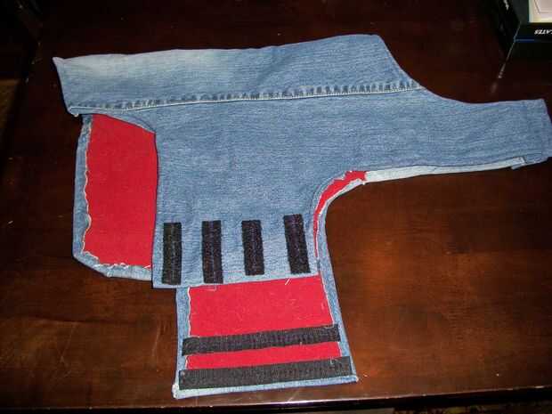 Esto es donde se pone realmente divertida! Puedes ver que mi chaqueta salió un poco diferente desde el boceto original. Decidí añadir un bolsillo trasero de los pantalones vaqueros en el panel lateral de la camisa. Para la pieza A, usé la parte delantera de una pierna de los pantalones vaqueros. Las otras piezas que corte de la parte posterior de mis jeans. La parte trasera de los pantalones vaqueros suelen tener piezas ligeramente más grandes que las delanteras. Como trabajar un rompecabezas, usted puede poner las piezas juntas de manera que usted puede hacer un buen ajuste para su perro. Una vez que la cáscara (denim) reconstruye, lo probé en el perro para asegurarse de que iba a conseguir un buen ajuste con el proyecto terminado.