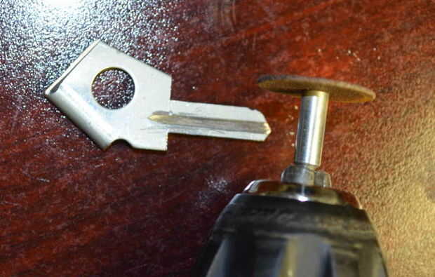 Llave en blanco haciendo fábricas tienen las láminas de corte de metales especiales para cortar las ranuras constantemente. A menos que tenga una de estas herramientas, sin embargo, las cosas se complican más. A pesar de que tenía acceso a una máquina de moler, no tenía fin molino pequeño para cortar esas pequeñas ranuras. En su lugar solía un taladro con un disco abrasivo para moler los canales en el lado de la llave. El trabajo era bastante grueso, pero la calidad de las líneas no es muy importante aquí. Como distancia aprieta bastante material así que la clave no es obstaculizada por las salas de la cerradura, y dejar suficiente material en la llave por lo que no encaje, es lo suficientemente bueno. Que puede ser difícil cuando hay salas a ambos lados de la ranura, y cuidado debe ser tomado para no moler directamente por en medio de su clave. Afortunadamente, el paletón de la llave tiene que ver con levantar correctamente los pernos que lo hace girar la cerradura, así que usted debe estar bien. Solo haz tu mejor esfuerzo.