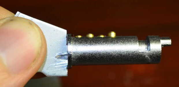 Ahora, muy cuidadosamente, presentar un surco en la parte superior de la clave de ese primer perno. La cantidad de material que se presentar a será igual a la distancia que el pasador se está pegando desde la parte superior de la base de la cerradura (no la altura entera del perno, no la altura del perno de la parte superior de la vaina de la cerradura). Una vez más, esto es más fácil de ver cuando se ha quitado la base de la vaina. Como presentar, comprobar con frecuencia la profundidad de la ranura insertando la llave en la cerradura y comprobar que la espiga inferior está trabajando con se sienta más cercano a la línea de corte. Asegúrese de que la ranura que está presentando es al menos tan amplia como el pin. Si la ranura es demasiado estrecha, el pin será atrapado en los lados de la ranura, y si no está tocando la parte inferior de la ranura que usted realmente puede estar presentando más profunda que debe ser sin ver el cambio como el perno se instala en el corte. También, tenga cuidado de no presentar su surco muy ancho, ya que esto afectará las transiciones pendientes desde un pin a otro que se requieren para las llaves se deslice suavemente dentro y fuera de una cerradura. Vamos a hablar en un momento. Puede ser difícil encontrar un archivo bastante estrecho para presentar estos surcos. Usar el borde del archivo de un joyero rectangular, pero en un apuro que puede utilizarse la esquina de un archivo más grande, fácil de mantener el fondo de su ranura paralela a la parte inferior de la hoja, si utiliza un archivo plano. Es posible utilizar un archivo más grande inclinado en un ángulo de 45 grados, sólo tienes que trabajar con más cuidado para obtener un recorte de fondo plano.