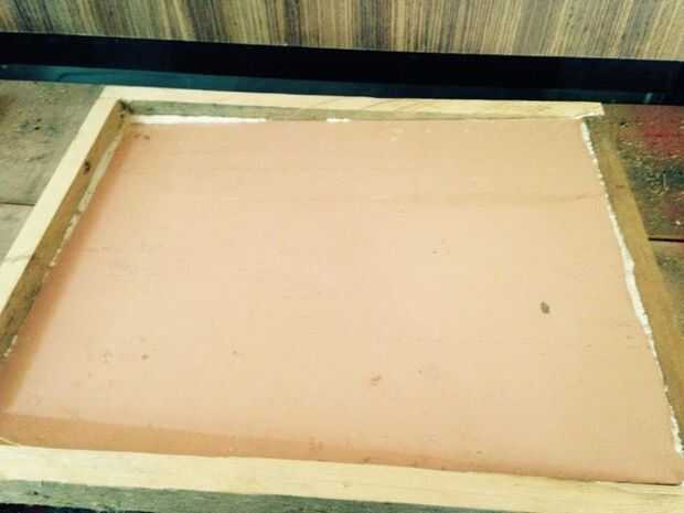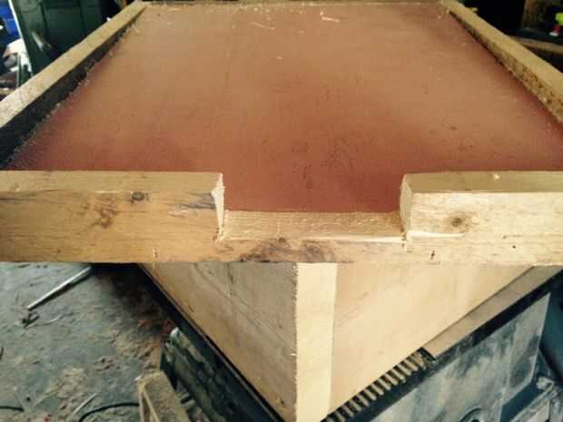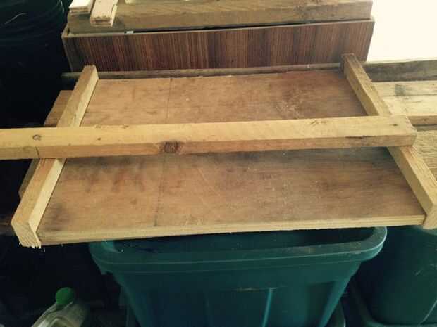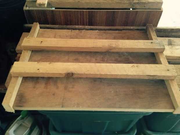 Unir las piezas de 4 marco y coloque la madera dentro del marco en un ángulo de espalda de frente. La idea aquí es que el piso de la colmena de abajo pistas hasta donde las abejas entran en la colmena. Así que la madera contrachapada es mayor en el extremo posterior de la colmena y menor en la parte delantera. Corte 4" de la estructura en el centro al ras de la madera contrachapada. Esta es la entrada de abejas a la colmena. El último id parte añadir una rampa de aterrizaje en el frente de la entrada. 2 piezas de deslizamiento en la parte inferior de la base actúan como soporte para la zona de aterrizaje. Cualquier pieza de madera o un trozo de listón de resbalón va a hacer.