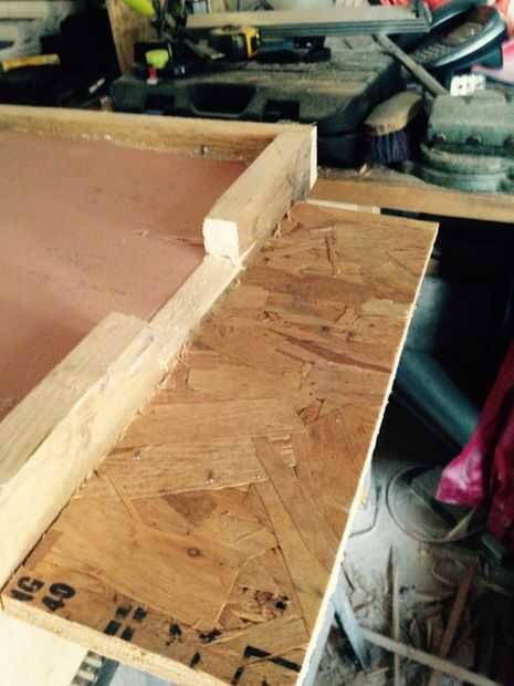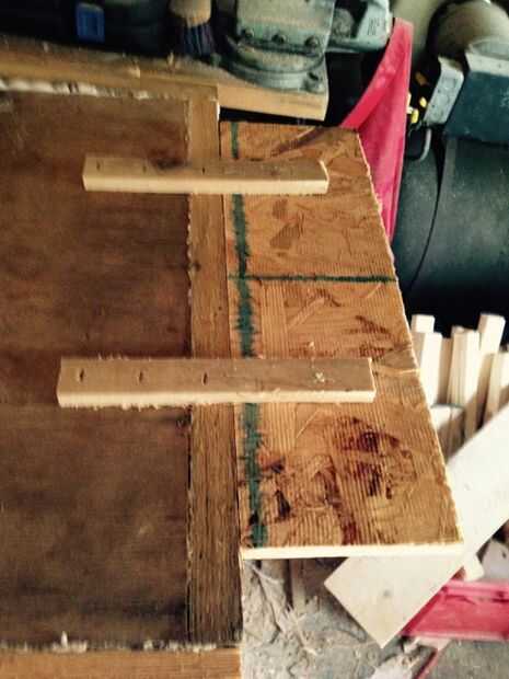 En este punto usted tiene una opción para hacer. Muy simple y fácil o un poco más complicado. El paso fácil es armar un marco simple caja colocando las piezas cortas en el extremo de las piezas largo creando una caja básica utilizando juntas de tope. Usted puede utilizar tornillos de 1 1/2" construcción, espiral clavos o grapas Si le sucede que tiene una buena pistola de grapas para hacer los empalmes. Usé pegamento y grapas para la mayoría de mi construcción. En foto 4 me has establecido las 2 piezas largo al lado de la madera contrachapada y han utilizado esto para marcar mi corte de los travesaños. Las 5 piezas antes del montaje final. (Foto 5)
