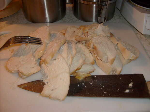 Retire el pollo del horno. Dejar enfriar brevemente sobre una tabla de cortar, y cortar el pollo en diagonal. Mientras tanto, en un medio de tamaño de cacerola, calor congelados verduras hasta que estén apenas caliente y todavía crujiente.