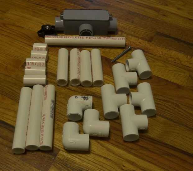 No podía ser más fácil con una sierra de corte o potencia de PVC (otra vez, yo soy un carpintero) Necesitarás: Uno 9 pulgadas Tres 6 pulgadas 4 pulgadas Cinco piezas "T" Piezas de tres "L" Tres 1.5-2 pulgadas piezas y 2 1.25 pulgadas También se muestran la caja gris de conducto, perno y perilla roscada.