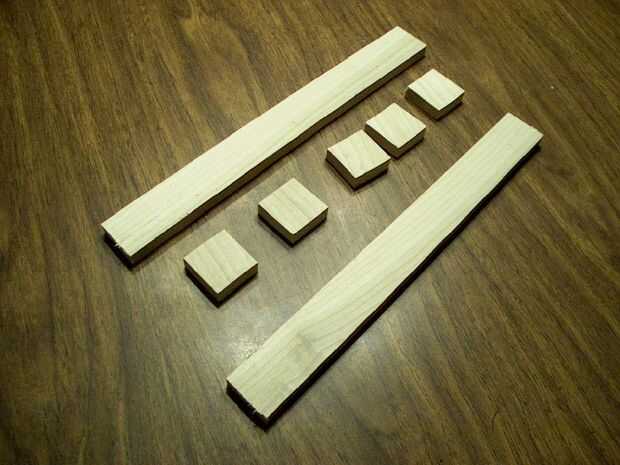 Si usted es capaz y desea hacerlo, puede extraer su propia madera a la medida. En caso de que usted ha limitado herramientas, se puede ir a una tienda de caja grande y comprar madera listo para el tamaño que necesita. Fui a Lowe y compró un pedazo de 1/2 x 1 1/2 pulgada de álamo. Cortar cinco cuadrados de 1 1/2 x 1 1/2 pulgadas. También corté dos piezas 13 1/2 pulgadas de largo.