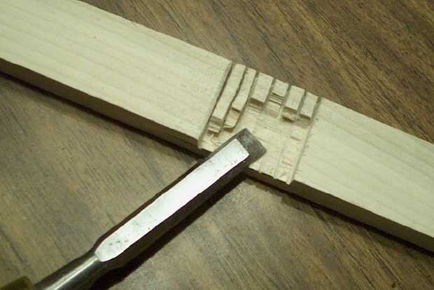 Encontrar el centro de cada pulgada de 13 1/2 pieza y haga una marca 3/4 de pulgada de cada lado de la marca por lo que hay 1 1/2 pulgadas entre los dos fuera de las líneas. Haga varios Sierra cortes exactamente a medio camino a través del espesor de las piezas. Retire los residuos con un cincel. Archivo por lo que las superficies son lisas, planas y quitar exactamente la mitad del espesor. Cuando las piezas encajan suavemente, pegarlos juntos para hacer una "X".