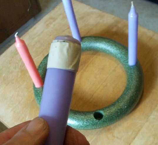 Si no tienes un taladro y una broca de 7/8 pulgadas, puede utilizar un cuchillo de sierra, como un cuchillo de pomelo, para hacer una toma para cada vela. Si hay cualquier error, puede que necesite utilizar masilla para rellenar huecos. Tenga cuidado de no romper la corona de espuma de poliestireno. O, me enteré de otra opción después de que ya había hecho esta corona. Es una vela individual con un pico en la parte inferior para perforar en la espuma de poliestireno. Estos se suponen que estarán disponibles en tiendas de artesanía. Vea un ejemplo en este enlace.