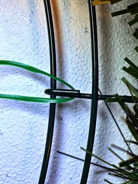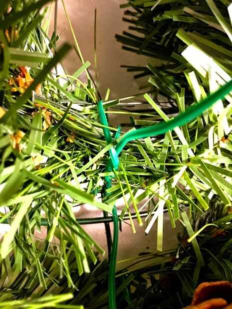 Asegúrese de que tener suficiente espacio para trabajar... Lugar de garland (parte inferior hacia abajo) en el marco de alambre (a partir de la parte exterior de la estructura de alambre primero) y enrolle el cable alrededor de la guirnalda y el marco varias veces, tirar ajustado para que la guirnalda está firmemente sujeta al marco. Corte el cable y meta cable bajo forma.