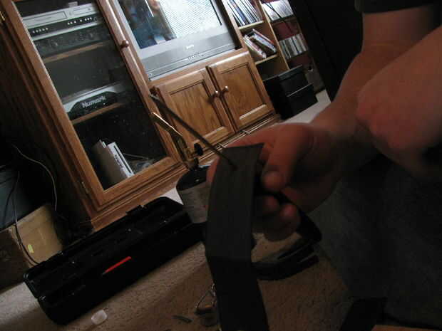 Ahora, después de las fotos, la cinta por el extremo macho del hilo de rosca y mantenerla cuando tenga suficiente espacio. A continuación, usted necesita encontrar dos puntos, una pulgada y media distancia en el centro de la anchura de la tela que servirá como el centro de los broches de presión. Luego, en su espacio de trabajo, use el punzón para hielo para hacer un orificio a través de ambas capas de tela.