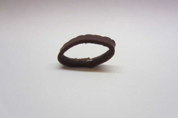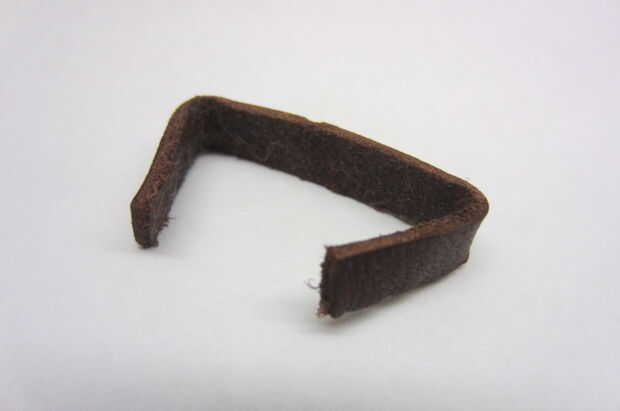Para hacer esta obra, usted necesitará un pedazo de cuero 45 mm de largo por 10 mm de ancho (una vez más, estas mediciones variará según la preferencia y el tamaño de la correa de reloj). Bien coser juntos, como se muestra. Puede presionar con una pila de libros o algo más pesado. Necesitará dos de estos, uno se fija a la correa y el otro será movible con el fin de evitar que el extremo largo de la correa colgando.