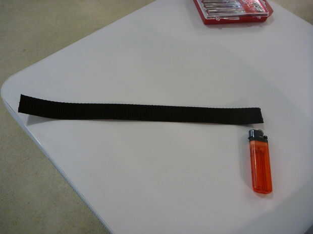 Corte la correa alrededor de 10" de largo y derretir los extremos para que no desentrañar.  (Usaba un cuchillo caliente, pero mayoría de las personas no tiene acceso.  Un encendedor cuidadosamente aplicado funciona muy bien, demasiado.)