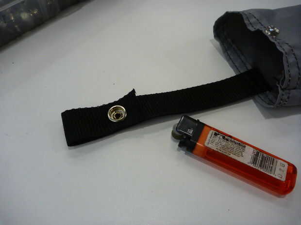Corte la cinta con suficiente longitud para dar a usted mismo sobre un bucle de 1" y aproximadamente 1/2" de últimos donde se instalará el complemento.  Cualquier tienda de lona puede instalar el complemento para usted por un costo mínimo.  Fuente Marina y ferreterías también venden kits de presión pequeña.  (Si hay una tienda de lona en su área, es mucho más fácil que instalar el complemento.  Cobrar $1,00 por cada uno de los broches de 2 presión necesitadas.)
