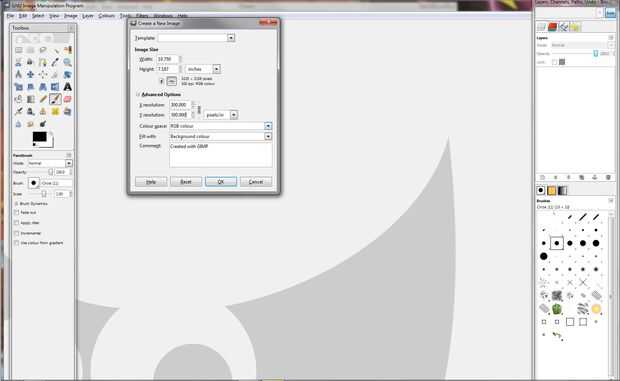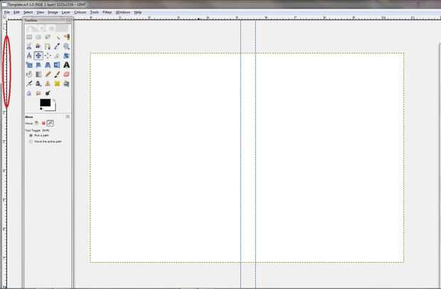 Primero desea crear una nueva imagen, 10 3/4 pulgadas de largo y 7 3/16 pulgadas de ancho. Luego arrastre una barra de la izquierda de la pantalla (un círculo rojo) 3 5/32 pulgadas de la izquierda de la imagen, así como 5 3/32 pulgadas de la derecha de la imagen, como se muestra. Esto crea un divisor que herramientas como la herramienta de selección rectangular se bloquea, lo que permite la fácil separación de la cubierta posterior (mitad derecha), espina (centro), y portada (mitad izquierda).