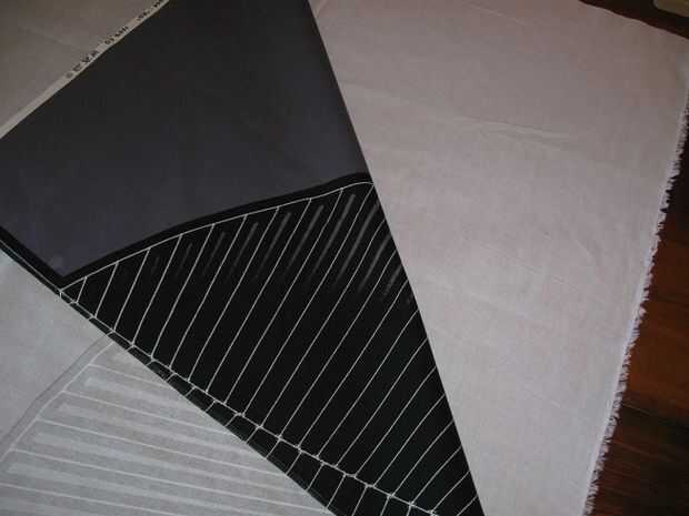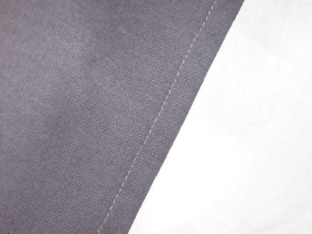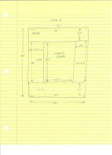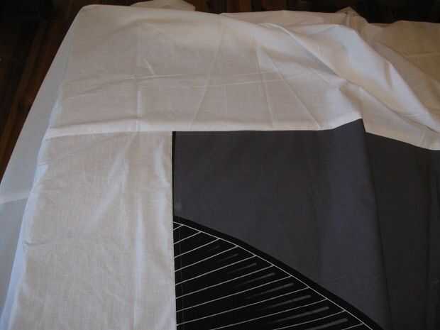 Lado B, el panel y el borde blanco, tiene diferentes medidas, ya que el panel interior es una sola pieza 45 "X 56". Corté el blanco en tiras de 27". Dos eran 56" de largo, y dos eran 100" de largo. Cosí el 56" tiras para los bordes exteriores del panel gráfico y cosí el 100" tiras para arriba y abajo de esa pieza central del panel blanco.