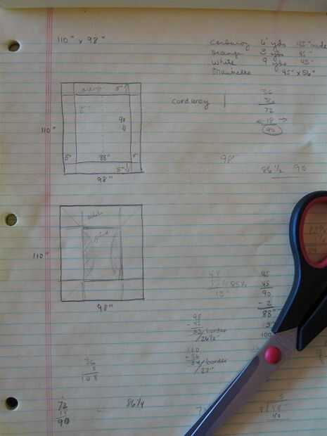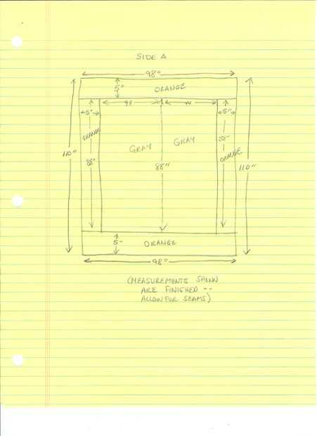 Porque los paneles del centro de mis dos lados tenían diferentes medidas internas (ese panel central), mis fronteras naranja (lado A) eran más estrechos que mi blanco unos (lado B). Lado A se hace de la pana y el algodón naranja. Me corte la pana en dos tiras de 90" y les cosió juntos a lo largo de un lado, formando un rectángulo mide 90" X 88". Corté la naranja en tiras de cuatro: dos medición 7 "X 90", y dos medición 7 "X 100". Estas mediciones permiten las costuras. Cosí una tira de 90" a la derecha del rectángulo gris (derecho lados juntos, por supuesto) y la otros 90" tira para el lado izquierdo del rectángulo gris. Cosí una tira de 100" de la naranja en la parte superior de la pieza gris naranja y la otra 100" tira de la naranja en la parte inferior de la pieza gris naranja.