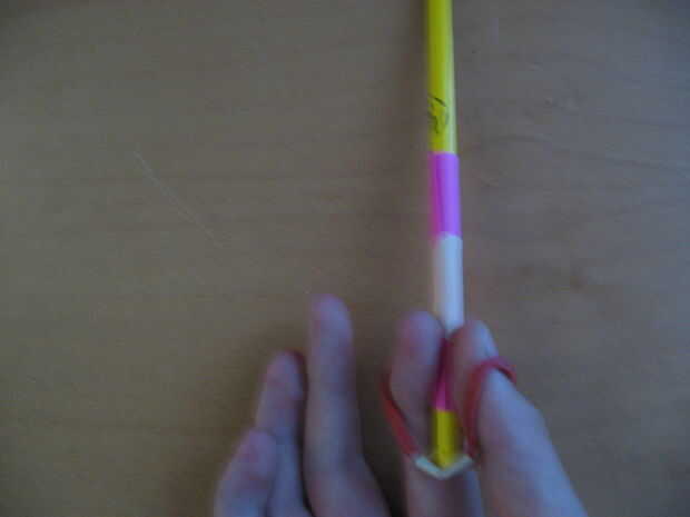 Use la otra mano para tirar de nuevo el lápiz en la banda de goma y el fuego!