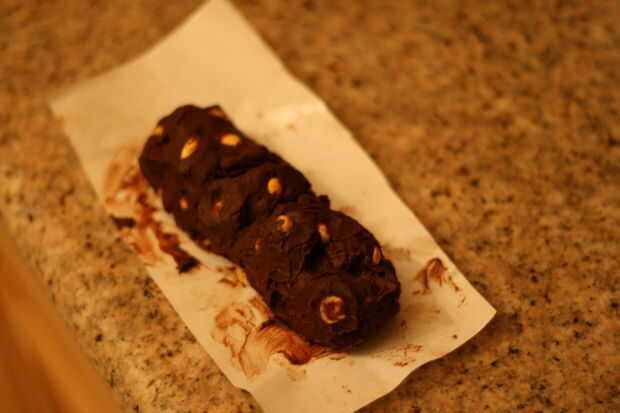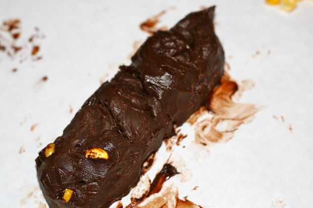 Colocar un congelador, pergamino o papel encerado como superficie de trabajo. No hay muchas fotos del proceso de moldeo, porque mis manos estaban cubiertas de chocolate. Por suerte, no se requiere precisión. Sólo tomar una cuchara (un melón, si tienes uno, sería increíble) y empuje hacia fuera algunos trozos de tomate cherry de tamaño y hacerlas rodar en bolas de diferentes tamaños. Luego, peguen las bolas de extremo a extremo y smoosh ellos juntos, añadiendo pedacitos más pequeños en la parte superior y a los lados hasta lo parece un turd. Di mina un saucy hacia arriba poco afilado final, causa soy artística como eso.