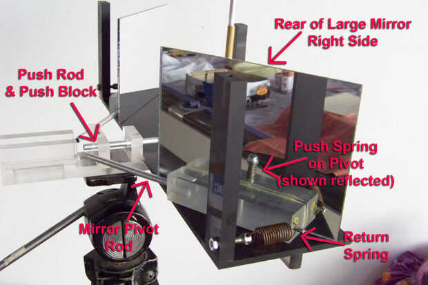 Hay probablemente muchas maneras que podría ser diseñado este control de convergencia, pero usé una pequeña leva en un eje que empuja una varilla de aluminio de 1/4 hacia atrás. En el extremo de la barra hay una pieza de plástico que se inserta en un par de barras de aluminio, que se une a cada uno del espejo grande monta. Los agujeros para estas barras se hacen también mejor antes de pegar los espejos en los Montes, y con mi sistema también hay pequeños agujeros para los pernos que se enganchan en los resortes de retorno. Coloque los resortes de retorno a los extremos exteriores de los montajes del espejo grande a tirar contra la leva, varilla de empuje y espejo varas. También usé pequeños resortes de empuje en el espejo grande de tornillos de montaje para que puedan moverse libremente pero permanecer plana contra la placa base.