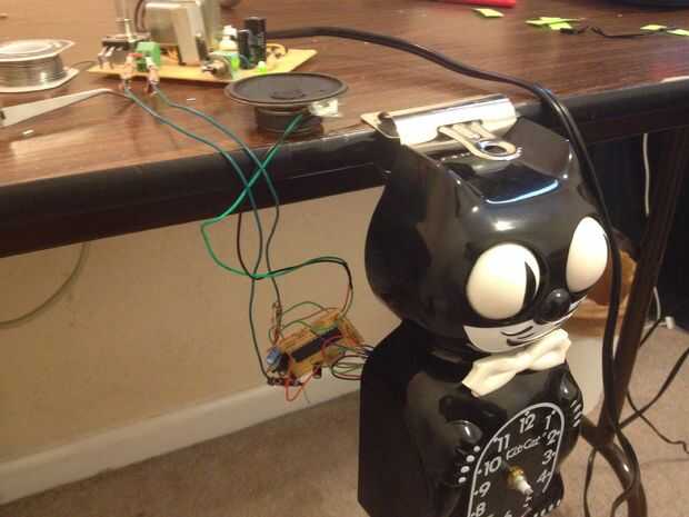 Este tutorial le mostrará cómo hacer un reloj de Kit Cat jugar un clip de sonido de "Miau", a intervalos de tiempo exactos, usando la Atmega 328P-up a través de la Junta de desarrollo de Arduino Uno. En mi ejemplo, el maullido se produce cada hora. Esto no tiene que ser o bien un reloj Kit-Cat, esta idea puede funcionar con otros relojes que utilizan un motor de imán.