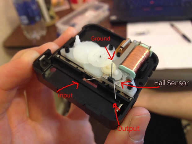 Un aspecto interesante de este proyecto está utilizando dispositivos analógicos (en este caso un reloj analógico) para interactuar con el mundo digital de la Atmel P 328-PU. Arduino es probablemente una de las maneras más simples para lograrlo. Que usando el motor de reloj típicas encontrado dentro de los clásicos relojes de Kit Cat para generar un pulso digital que alimentará en el chip Atmel. La razón que esto funciona es porque el motor de reloj utiliza un imán permanente, situado en las cercanías de una bobina para crear el par mecánico necesario para hacer girar las agujas del reloj. Se aprovecho de este campo magnético utilizando un sensor de efecto Hall para detectar el flujo magnético del motor de reloj. El sensor digital alto de salida cada vez que uno de los polos del imán hacia el sensor y luego de la salida un bajo cuando el polo opuesto está cerca del sensor. Esta transición del poste ocurre cada segundo, o tiene una frecuencia de 1 Hz y es la razón por qué esto sirve como un motor ideal para la conducción de agujas del reloj.