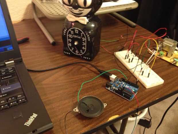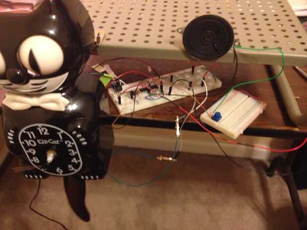Si todo va bien, encienda el reloj y compruébelo para asegurarse de está contando los pulsos del reloj y luego entrega de salida. Nota: cuando originalmente lo hice, puse el contador de reproducción de audio para cada 60 segundos por lo que no tengo que esperar una hora entera para ver si estaba trabajando, entonces más adelante cambié el contador a 3600 segundos o 1 hora). Para cambiar el intervalo de maullido, ubique la pieza de código junto a las últimas líneas y buscar la variable clockCount. Cambiarlo a cualquier valor que desee.