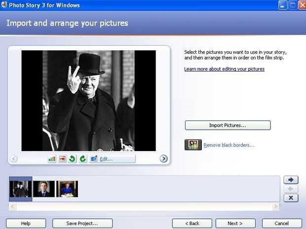 3. abrir Photo Story 3. En la pantalla de inicio selecciona nuevo proyecto daefault. Haga clic en siguiente y a continuación, importar imágenes. Cargar algunas fotos. Haga clic en siguiente. Te sugiero pasar por alto lo de quitar bordes negros: me parece líos sólo por su formato. Así que cuando se le pregunta con incredulidad si realmente desea continuar sin la eliminación de bordes negros a decir que sí. A diferencia de Barbara Bush.