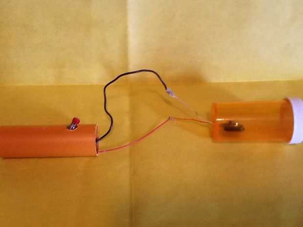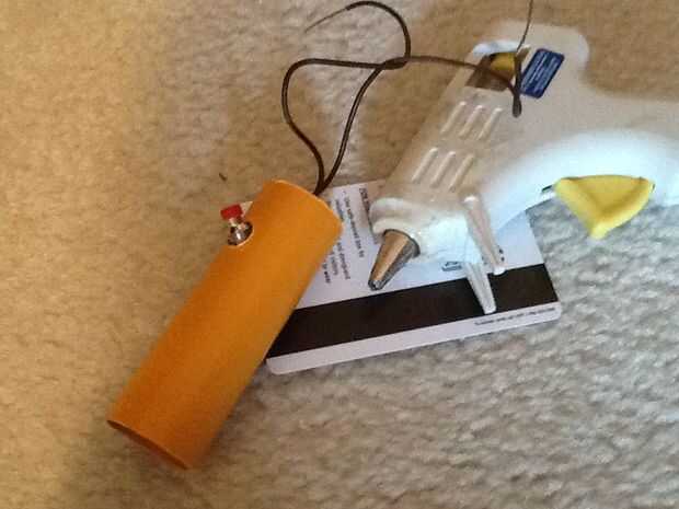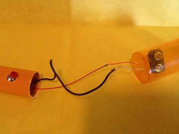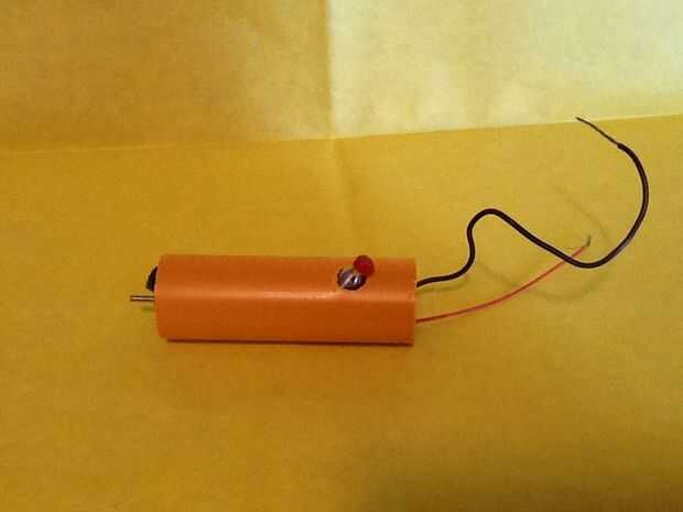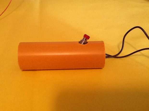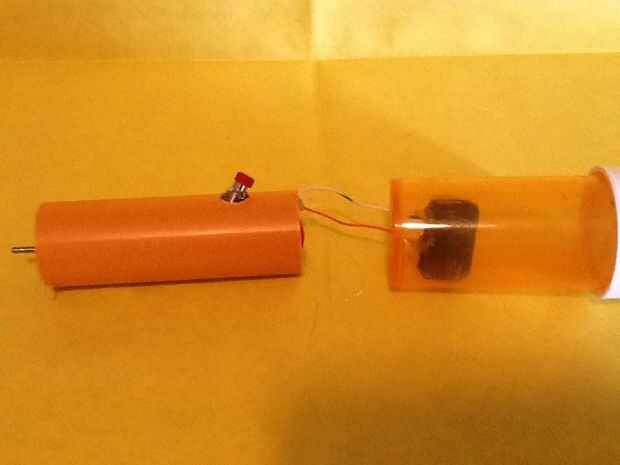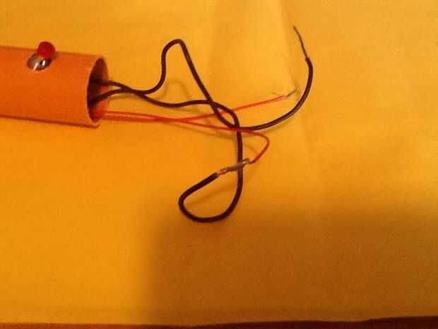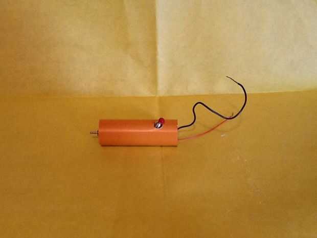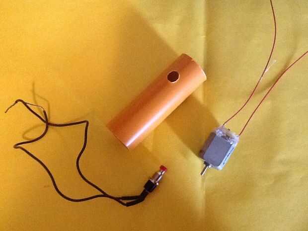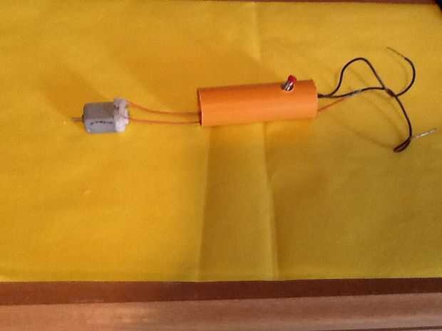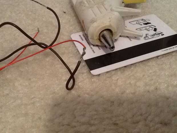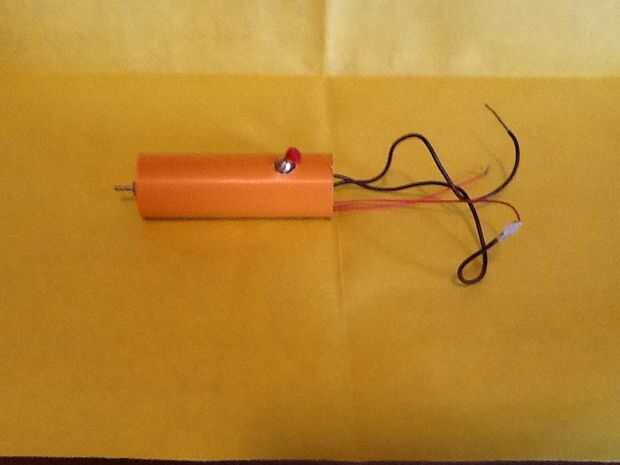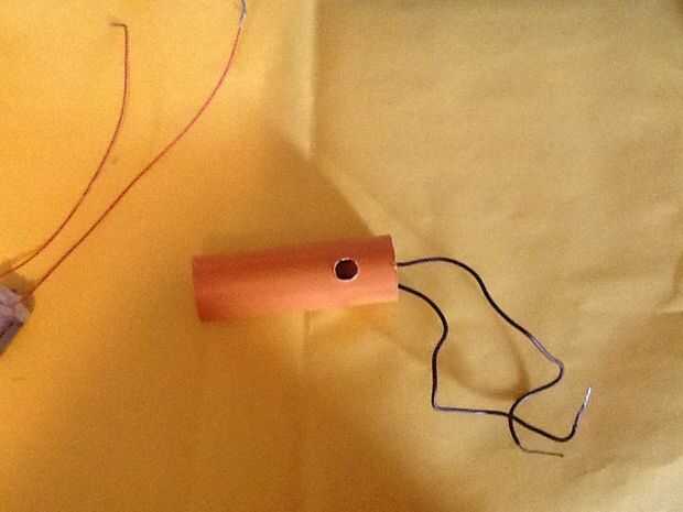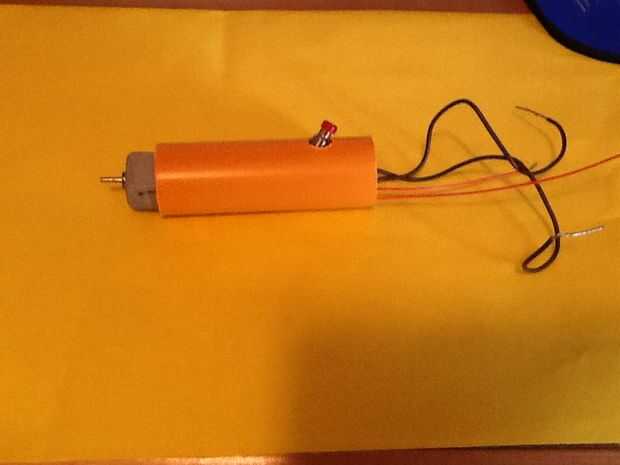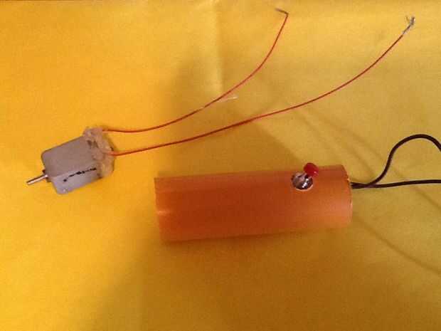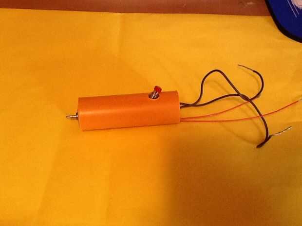 Ahora, insertaremos nuestro motor en el extremo opuesto de la tubería; esta manera, los cables del interruptor y los cables del motor sobresaldrá del mismo extremo de la tubería! Una vez, mire los cables que tienes. Conecte cualquier un cable del interruptor a cualquier un cable del motor. Trence los dos cables y asegurar la conexión con el adhesivo caliente.