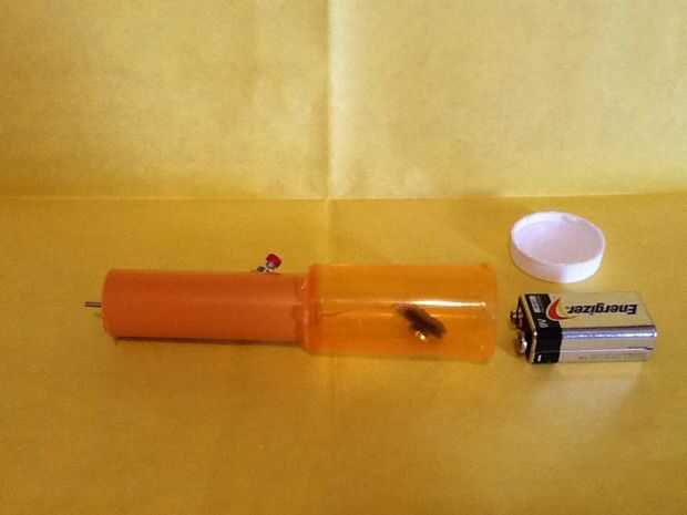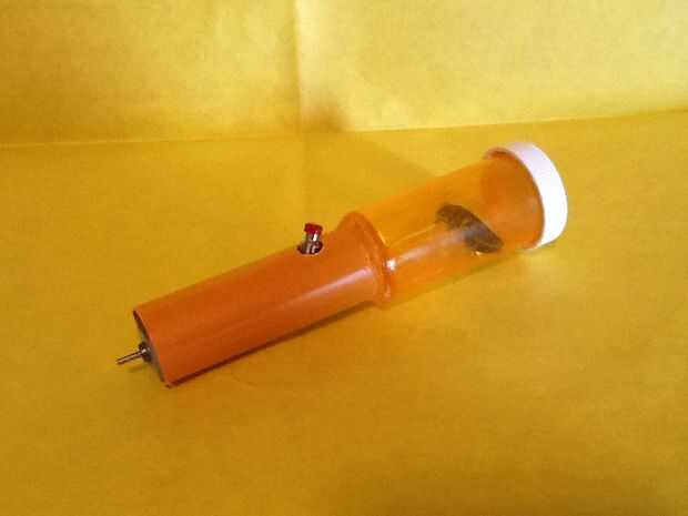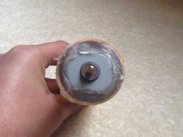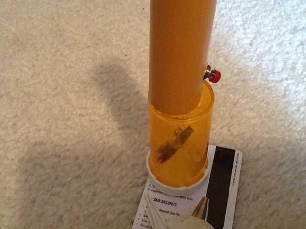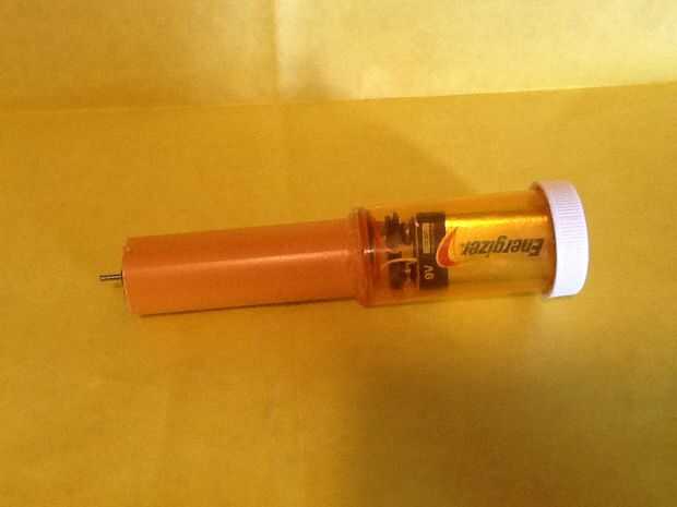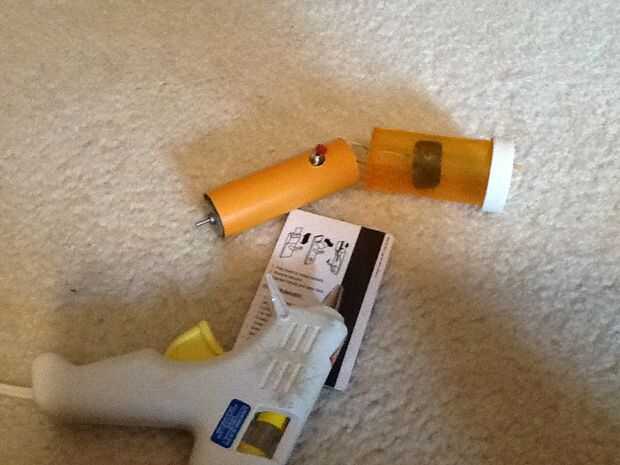 Tomar sus dos componentes casi terminados y los junte para que el borde de la tubería de tierras en el centro de la botella de la medicina. Pegue esto firmemente en su lugar con pegamento caliente. Una vez pegado firmemente, permite centrarse en asegurar el motor. Aplicar un montón de pegamento a los lados del motor por lo que permanece en lugar mientras que en la dremel. El motor enfrentará a mucho empujar y de tirar mientras que poner y sacar los accesorios, por que es importante asegurar en su lugar!