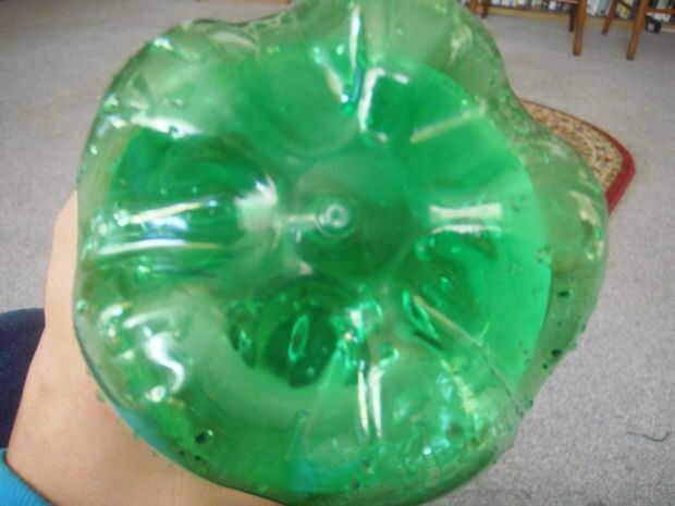 Voltear la botella y utiliza el poke cuchillo escondido a lo largo de las protuberancias en la parte inferior de la botella, asegúrese de que las ranuras no son demasiado grandes (es demasiado grande cualquier más ancha que una moneda de diez centavos). Un agujero por el golpe y uno en el centro de la parte inferior de la botella.