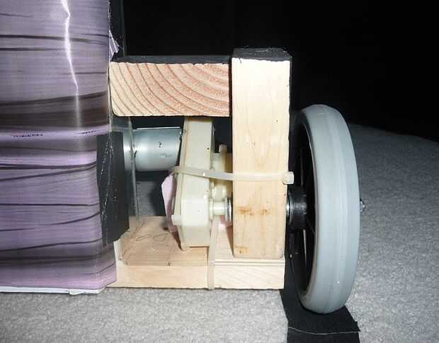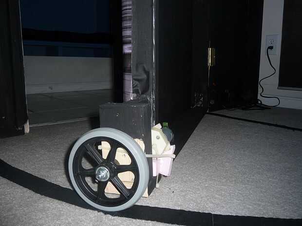 La rueda y el motor fueron montados para que la rueda se extiende por debajo y apoya, la parte inferior de la estructura de la puerta.