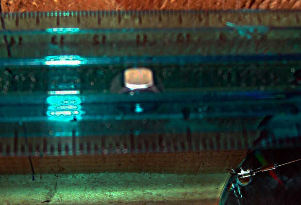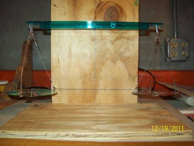 Ahora si usted medido y perforar todo perfectamente, la escala de la regla debe colgar nivel con los CDs tanto en el área sombreada... justo como la mía no es. No se preocupe... tomar una tuerca de 1/4-20 y un lugar en la ranura del pulgar Sujete de la parte alta y moverse de izquierda a derecha hasta que los CDs están en el área sombreada. A continuación, una vez que la balanza está equilibrada pone una gota de pegamento para fijar la tuerca en su lugar.