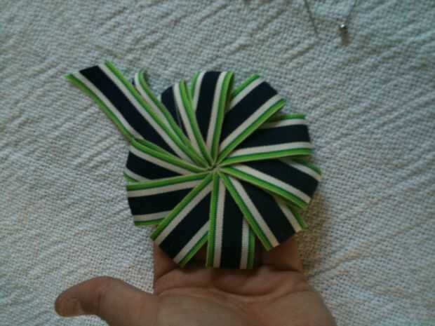 Usando el extremo del hilo largo y una largo puntada corriente, puntada alrededor del centro de la escarapela, asegurándose de que la costura no aparece en el frente. Dos pasadas de puntada alrededor de la parte posterior, coser a través de cada bucle, coser por detrás al final para garantizar. No corte el hilo hasta que Adorno se agrega.