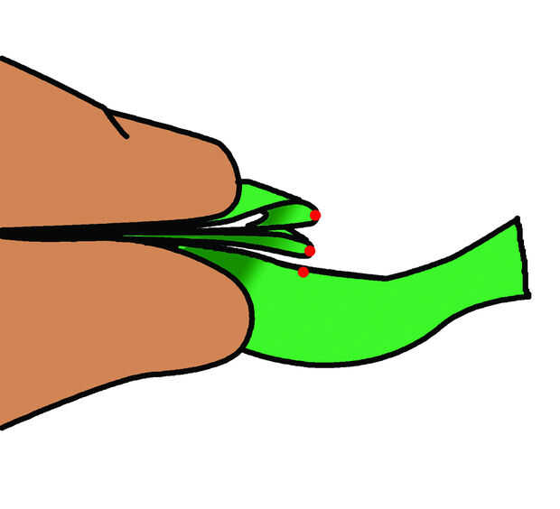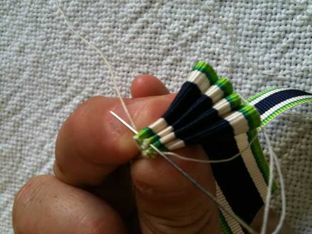 Pellizcar la cinta cerca de los extremos de los bucles primera. Coloque la aguja en el extremo suelto de la cinta en el borde más cercano a usted (si eres zurdo esto se invertirá en la foto). En el punto directamente debajo del primera final de bucle (punto más bajo) hacer una puntada, captura de sí mismo en la cinta inferior. Coser en el borde de la cinta, a través del primer lazo en el lugar indicado por el punto medio, espalda puntada a través de la capa base y el bucle, continuando la puntada en el lazo siguiente (punto superior). Coser por detrás para asegurar el segundo bucle, a través del primer lazo debajo de él en el primer sitio de puntada de costura.