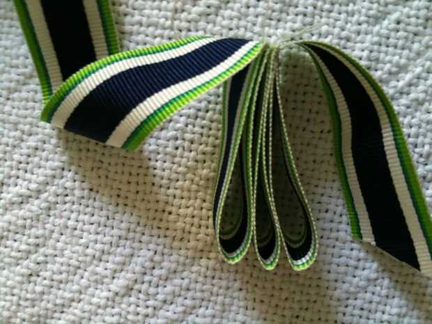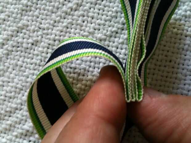 Hacer un tercer lazo, emparejar tan de cerca como sea posible la doble vuelta y coser por el borde como se muestra. Tenga en cuenta que el otro extremo de la cinta quedo descosido. Puntada a través del doblez anterior y el nuevo doblez para garantizar de nuevo. A continuación es lo que la pieza de trabajo debe parecerse a este punto. Tenga en cuenta que los pliegues son segura y firmemente.