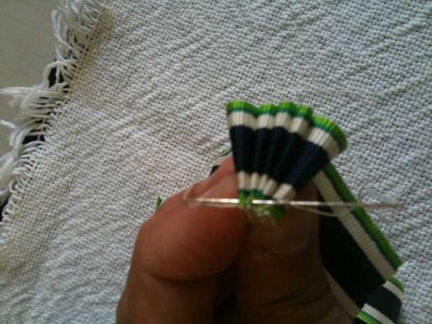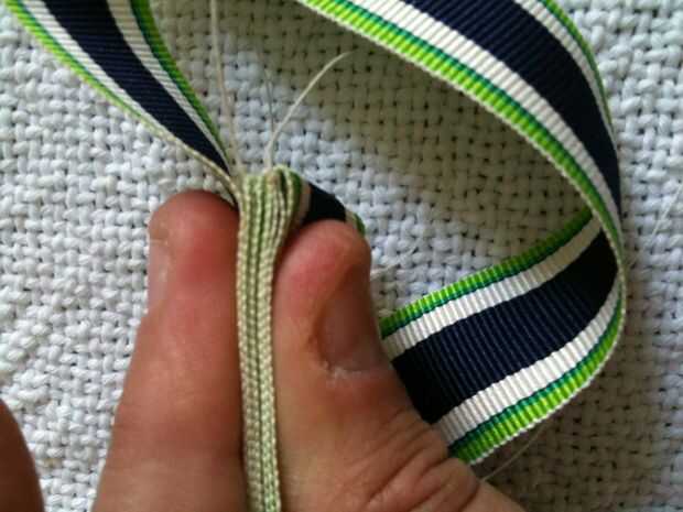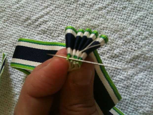 La pila es que viene a lo largo-seguir doblando y cosiendo cada retorno al bucle anterior. No hay ninguna regla real en cuanto a cuántos bucles, para así seguir haciendo esto hasta llegar al final de la cinta...