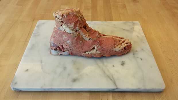 La carne no es un medio muy tradicional utilizado en escultura. Aunque sin duda existen esculturas de carne, no es fácil hacer las estructuras complicadas y complejas con carne porque naturalmente no pegan trozos de carne y porque la mayoría de las carnes no es lo suficientemente rígida para formar algún tipo de estructura. Sin embargo, con un molde y un poco de transglutaminasa (AKA "pegamento de carne"), escultura con carne cruda se convierte en muy fácil! Hace poco probé una técnica simple de llenar un molde con la carne cruda y transglutaminasa en orden se fusionan diferentes piezas de carne en una forma rígida y una escultura. El resultado final--un "pie reconstituido" hecho de vaca pies, pies de cerdo y patas de pollo--se muestra en la imagen principal. Con esta técnica puedes hacer todo tipo de esculturas de carne de casi cualquier tipo de molde, y algunos de ellos incluso podrían ser comestibles!