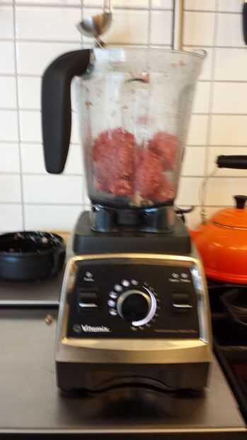 Una vez que tienes la carne cómo usted lo quiere, es el momento de añadir en la transglutaminasa. Me agrega carne molida de res, lomo de cerdo y 1% en peso de transglutaminasa a un Vitamix y mezclan todo. (Por ejemplo, si tuviera 500g de carne picada, agrego 5g de transglutaminasa a la mezcla.) Ya he utilizado carne de res y lomo como una matriz en la que se establece las más grandes piezas de carne, no añadir cualquier transglutaminasa directamente a las piezas de carne que cortar para arriba. Si no utiliza un líquido más como medio de carne picada, basta con espolvorear transglutaminasa en la superficie de la carne y poner en contacto con otra pieza de carne. Asegúrese de que la capa de la transglutaminasa es fino y bien distribuido por todas partes que usted quiere la carne para permanecer juntos.