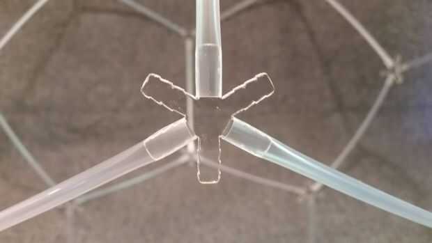 Ahora con la paja de longitud 85% (60) y los cubos de cinco puntas (12), el marco de las triangulaciones internas para cada uno de los rostros de 12 Pentágono del dodecaedro. Ver video de orientación sobre cómo deslizar la paja sobre los cubos de cinco puntas.